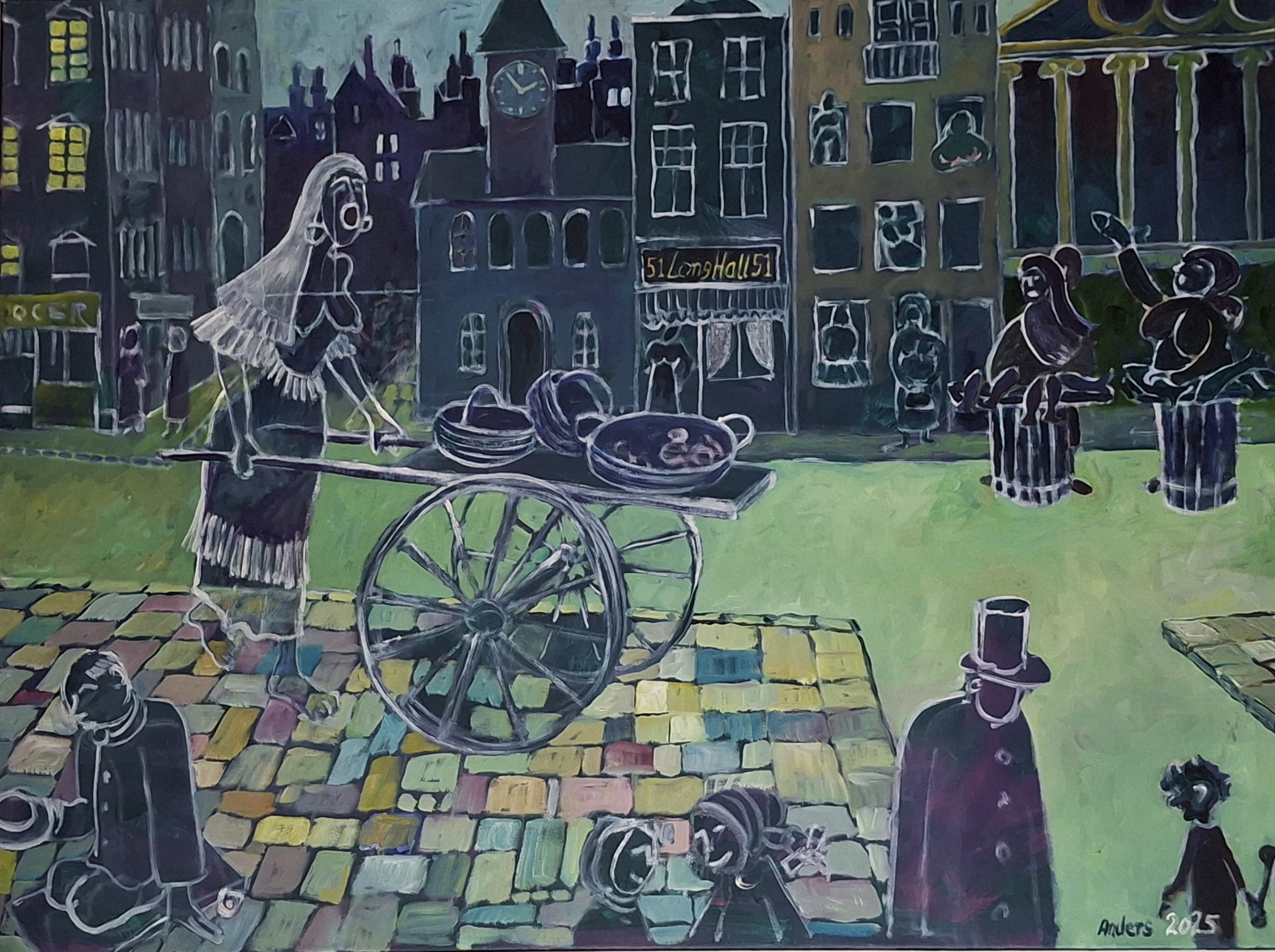 Et af mine yndlingsmotiver har gennem tiderne været tabloer, gerne bybilleder, hvor der foregår en hel masse. "Skyhøj dame i byen" er et eksempel på sådan et billede. På det seneste (2016) har jeg malet flere billeder med lignende motiver: Huse eller landskaber med en masse forskllige mennesker i..