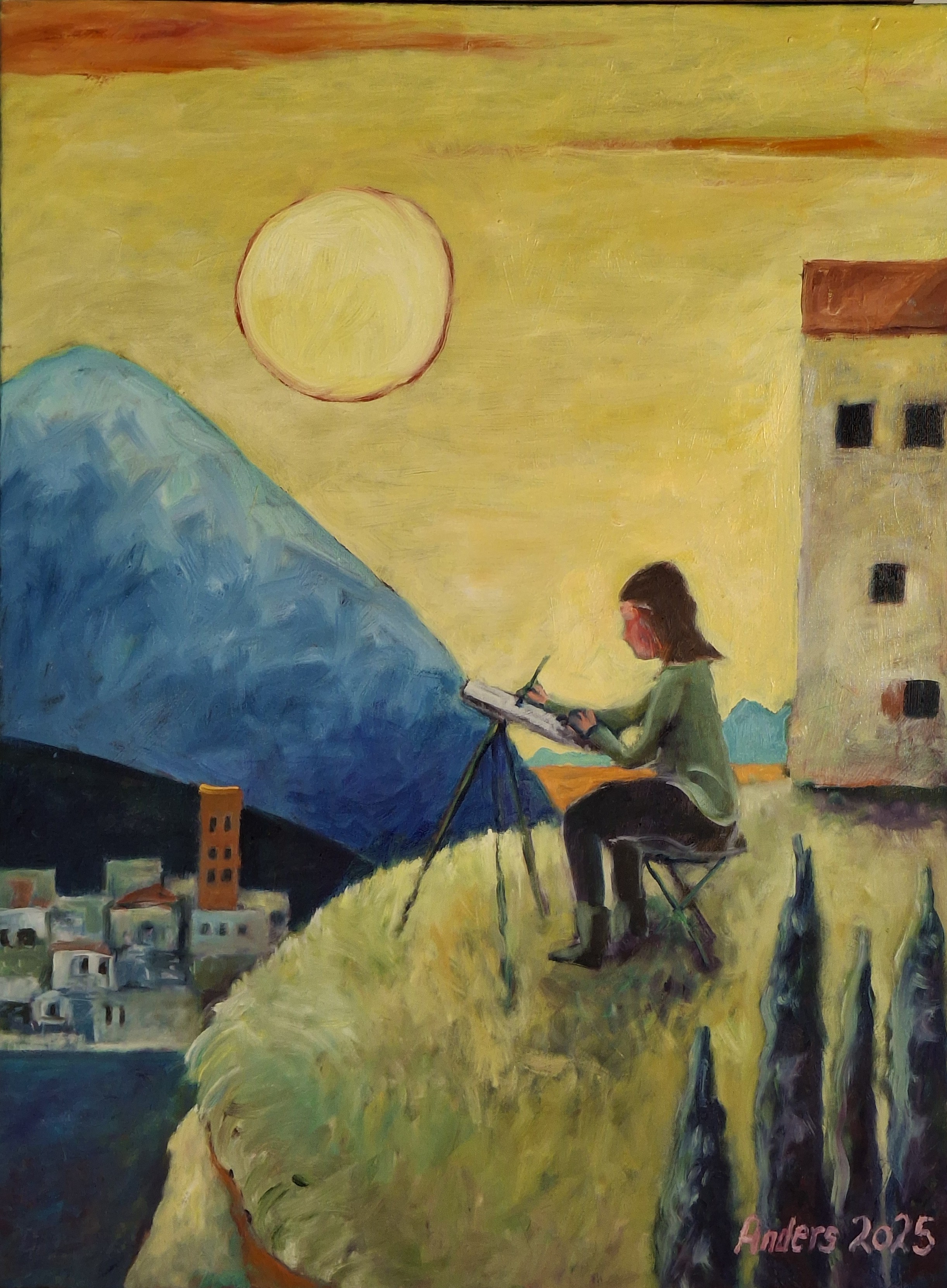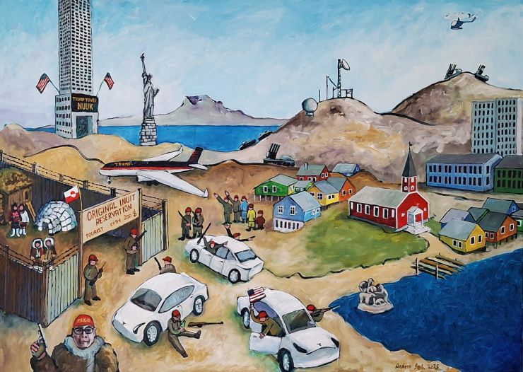 Efter Trumps udmeldinger i februar 2025 om, at USA vil overtage Grønland, kunne jeg ikke sove om natten. I stedet stod jeg op og påbegyndte mit hidtil største maleri: ”Trump i Nuuk” (akryl og olie 100 x 140 cm).