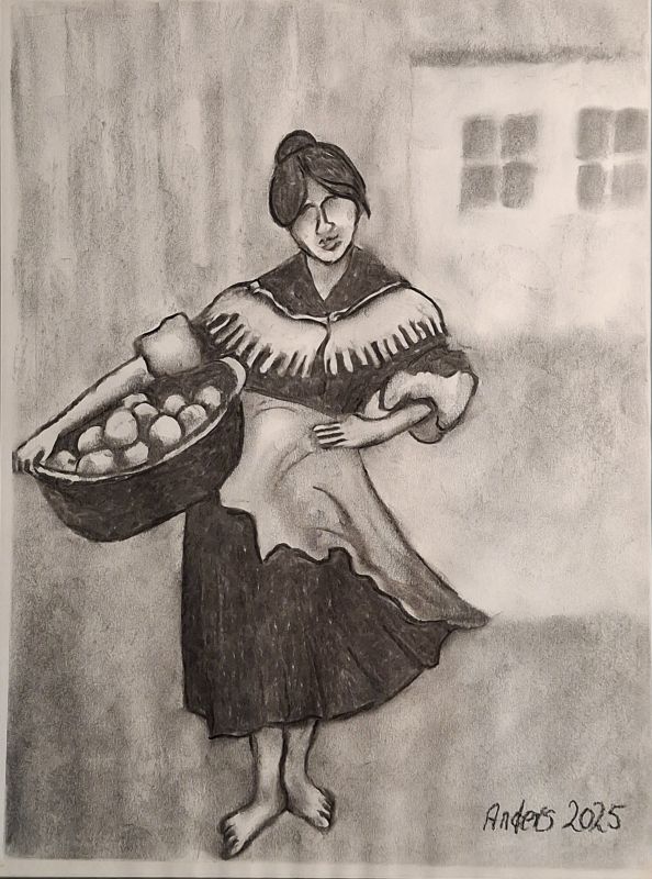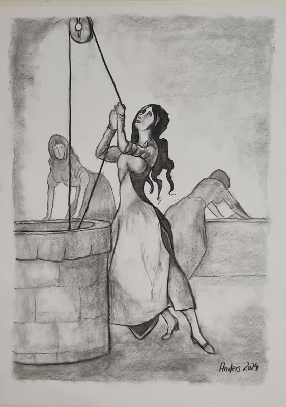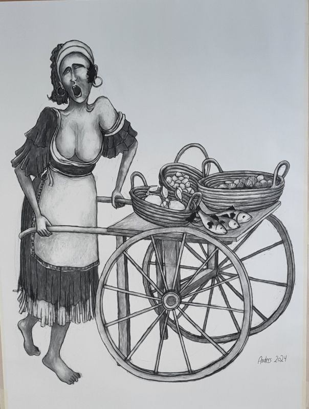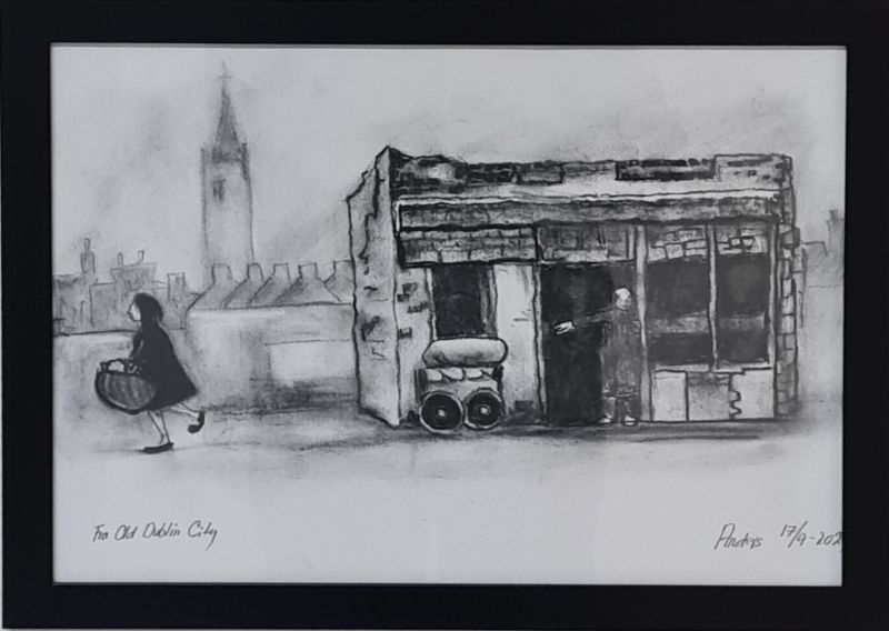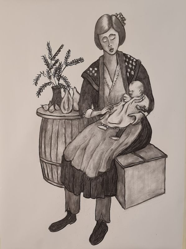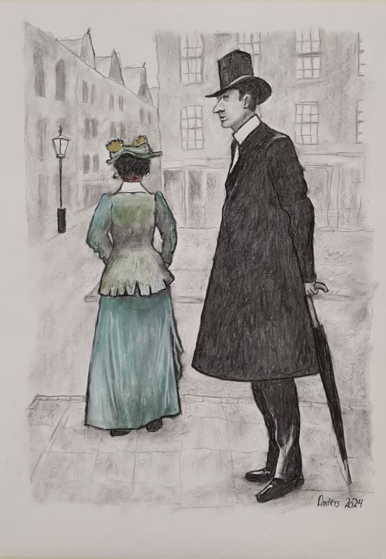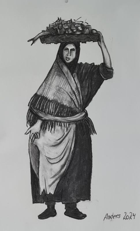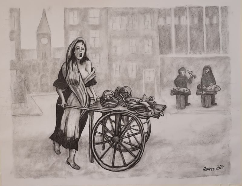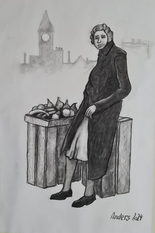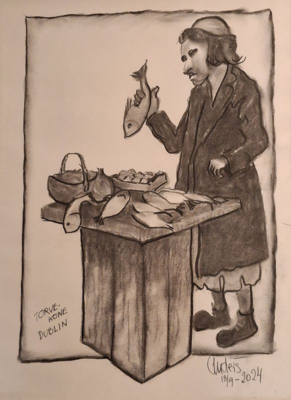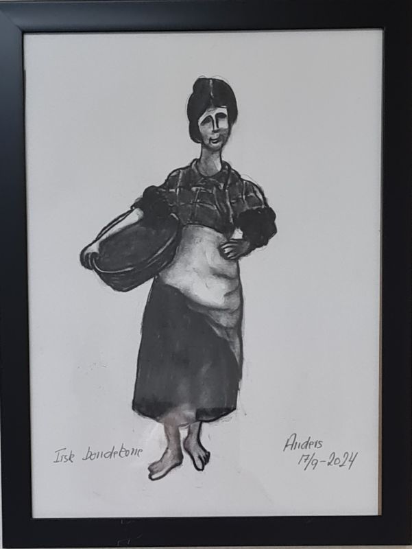 Jeg har længe været en stor elsker af folk-music fra Irland, Skotland, Canada osv. Jeg blev inspireret til at lave billeder af Molly Malone (fra balladen "In Dublins Fair City - the girls are so pritty osv."). Og jeg fik lyst til at vende tilbage til at tegne med kul, som jeg tidligere (i 1960-erne) har arbejdet en del med. Det er foreløbig blevet til følgende kultegninger og pastelbilleder: