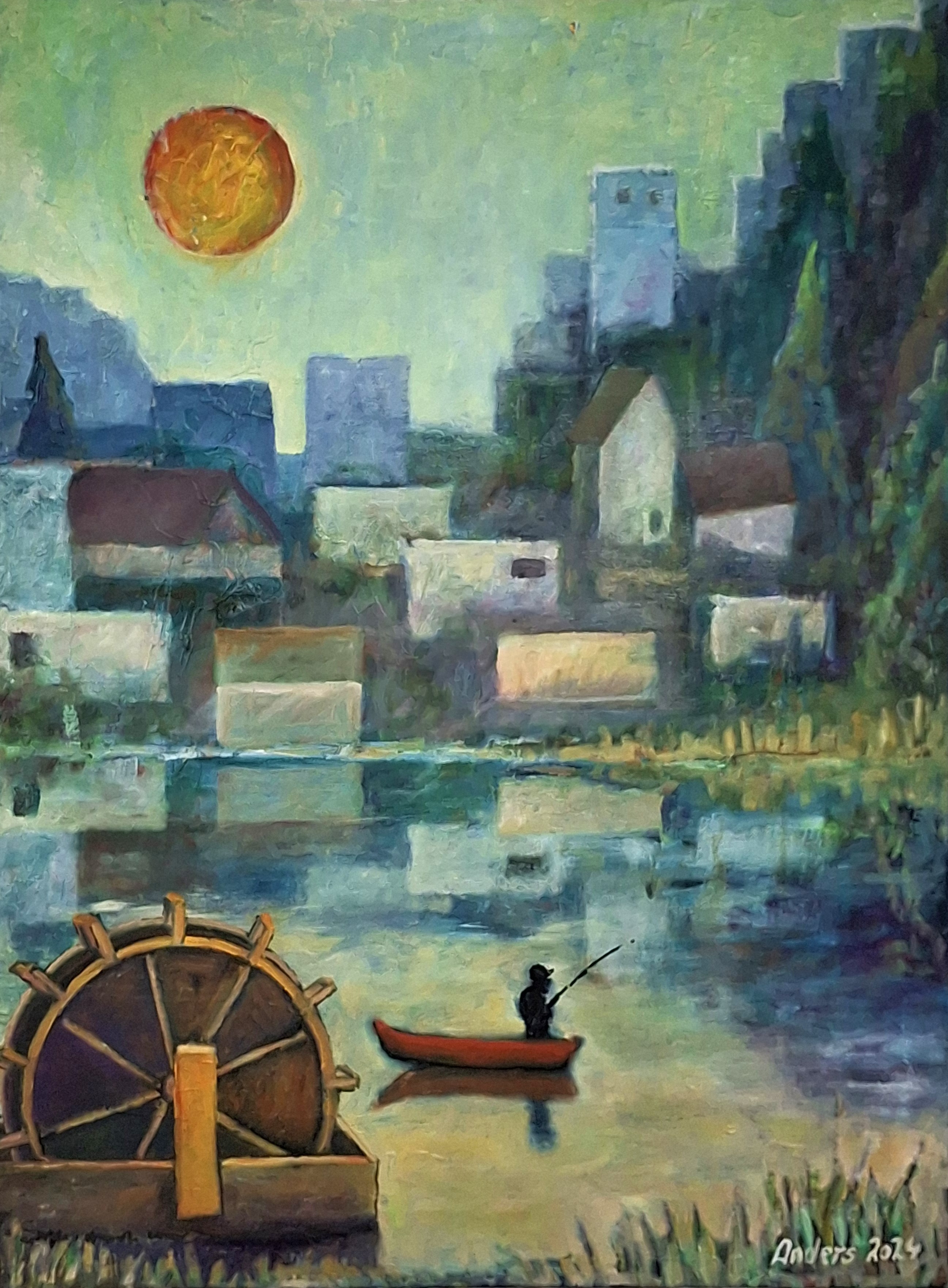 Jeg udstillede i sommeren 2024 i "Den Grå Hal" i Nykøbing Sjællands Havn som medlem af AKIO (= Aktive Kunstnere I Odsherred). Også her har jeg indbygget "levende" ure i mange af mine billeder: